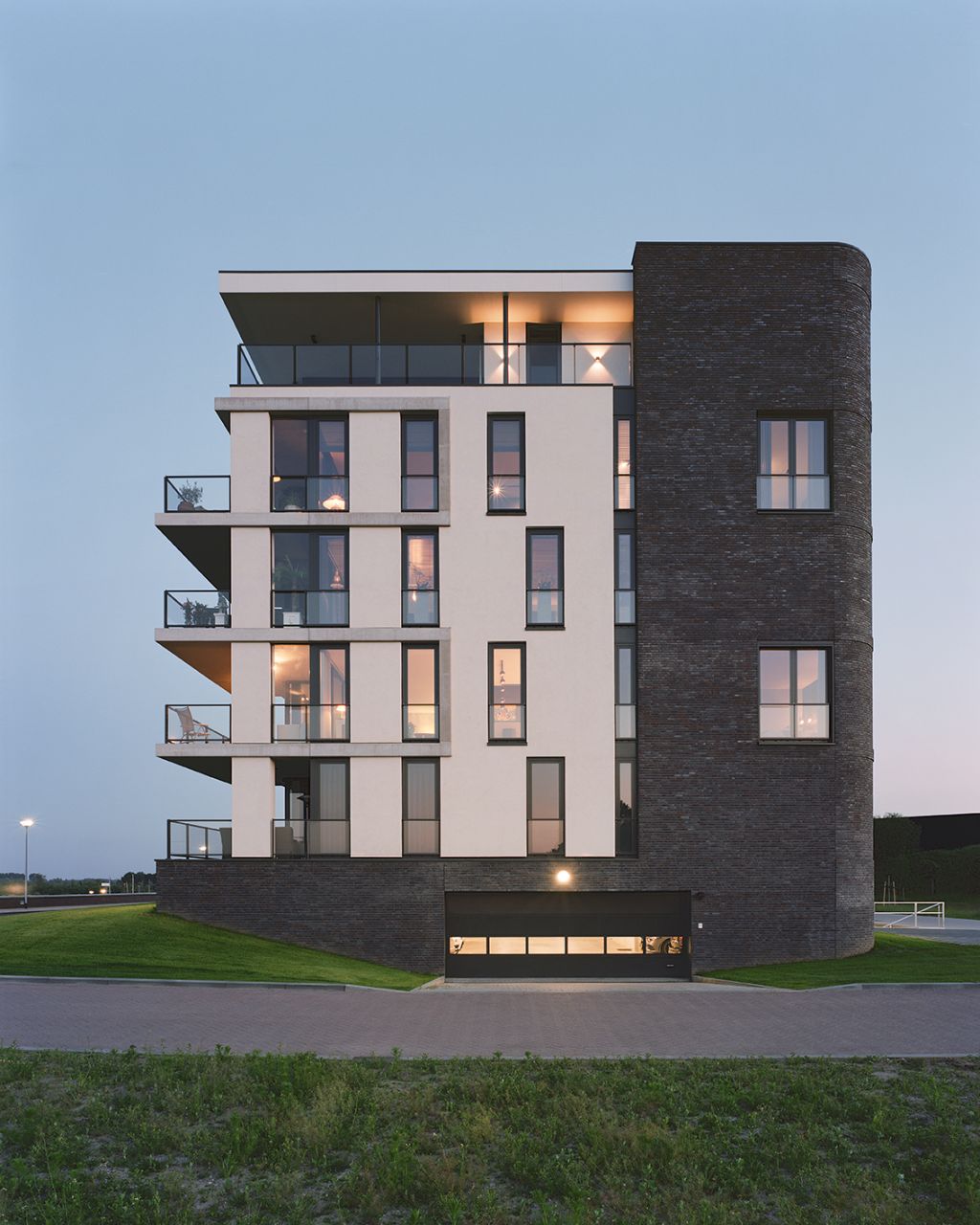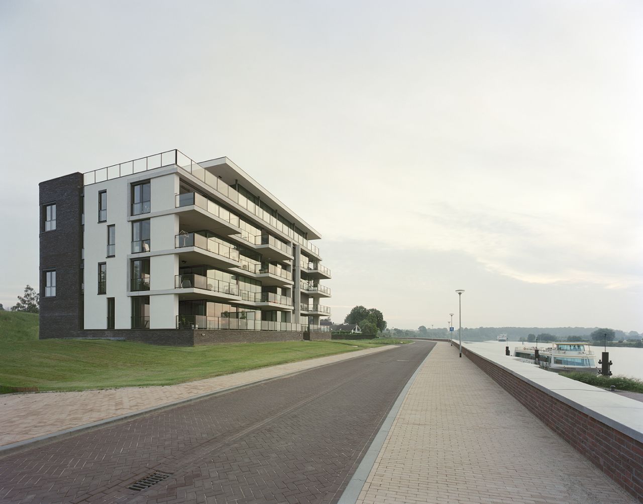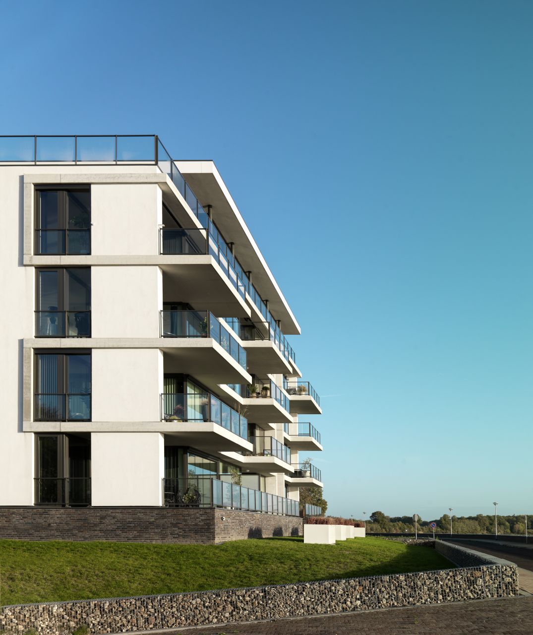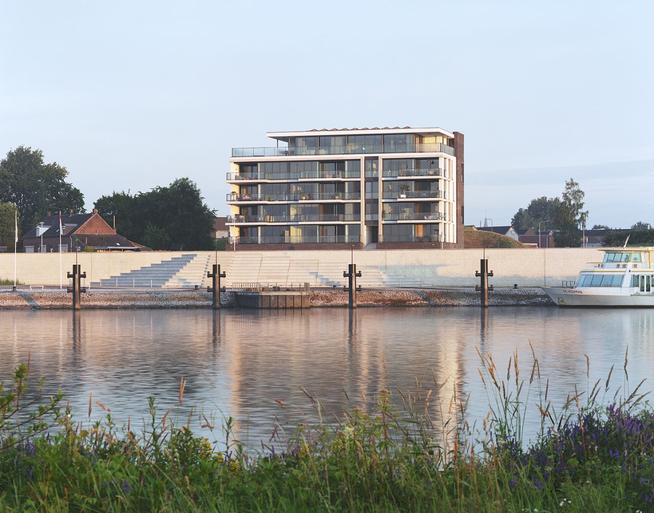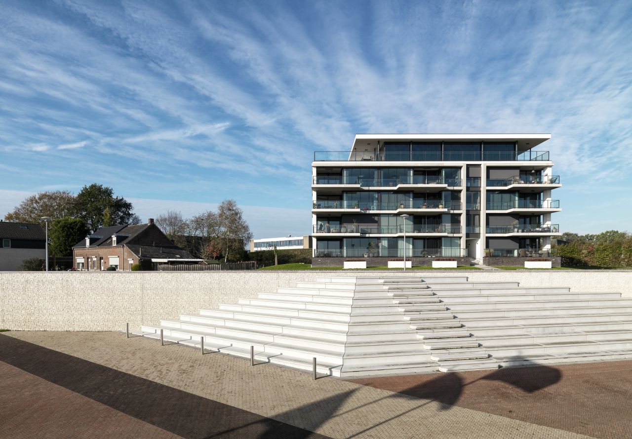 Door veelvuldig gebruik van glas creëerden we een maximaal uitzicht op de Maas. Zelfs de bewoners van de eerste woonlaag kijken vrij uit over het water en de taludtuin met grassen. Dit doordat het appartementencomplex bovenop een parkeerplint staat. De verspringende balkons en het gebruik van wit aan de maaszijde geven het gebouw een open, dynamisch en maritiem karakter. In combinatie met de gemetselde rug en plint van het gebouw zorgt dit voor een mooi ensemble van vorm, materiaal en kleur.